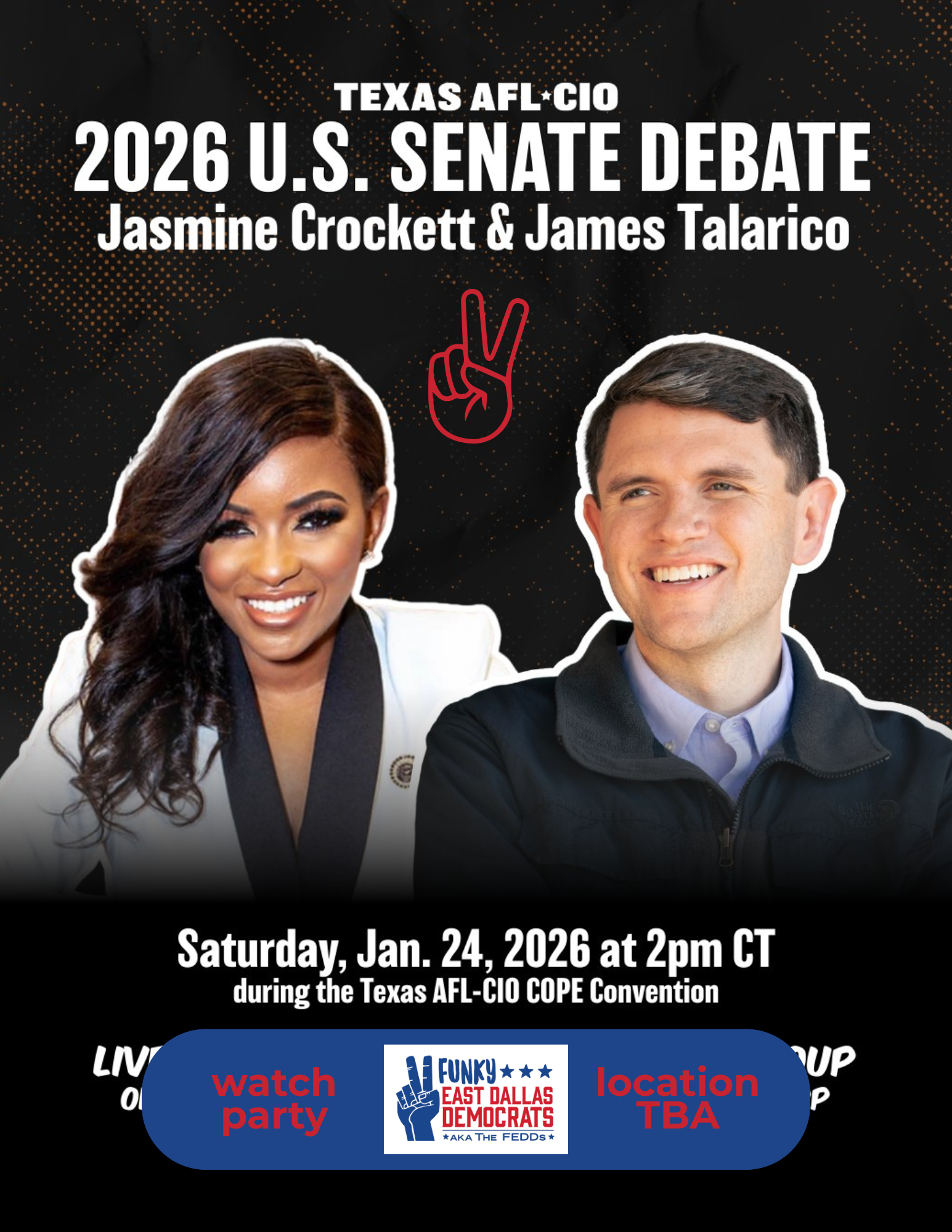 The AFL-CIO is hosting the debate between US Rep Jasmine Crockett and TX Rep James Talarico at 2pm on TV. We’ll watch it together and chat about this most exciting primary race. Who we select in this election MUST win in November, so let’s make sure we are all informed and ready to help GOTV (get out the vote) to flip this seat!